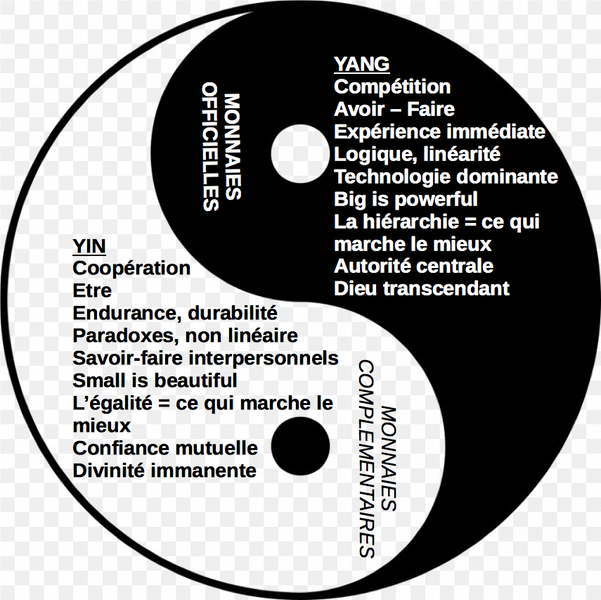 En effet, comme le montre le symbole du yin-yang ci-dessus, les monnaies dominantes actuelles sont de type Yang, de compétition, de contrôle, de puissance et de dominance alors que le domaine de la santé et du bien-être est de nature Yin, de confiance, de partage, de long terme pour lesquels une monnaie complémentaire serait plus adéquate.